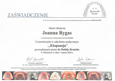 z najwyższych wyników w kraju w Lekarsko-Dentystycznym Egzaminie Państwowym umożliwiło mi rozpoczęcie w 2022 roku programu specjalizacyjnego z ortodoncji we Wrocławiu. W 2024 roku w Warszawie zdałam Państwowy Egzamin Specjalizacyjny w dziedzinie ortodoncji, który potwierdził moje kompetencje zawodowe. W 2025 roku zakończyłam 3-letnie szkolenie specjalizacyjne, uzyskując tytuł specjalisty ortodoncji.